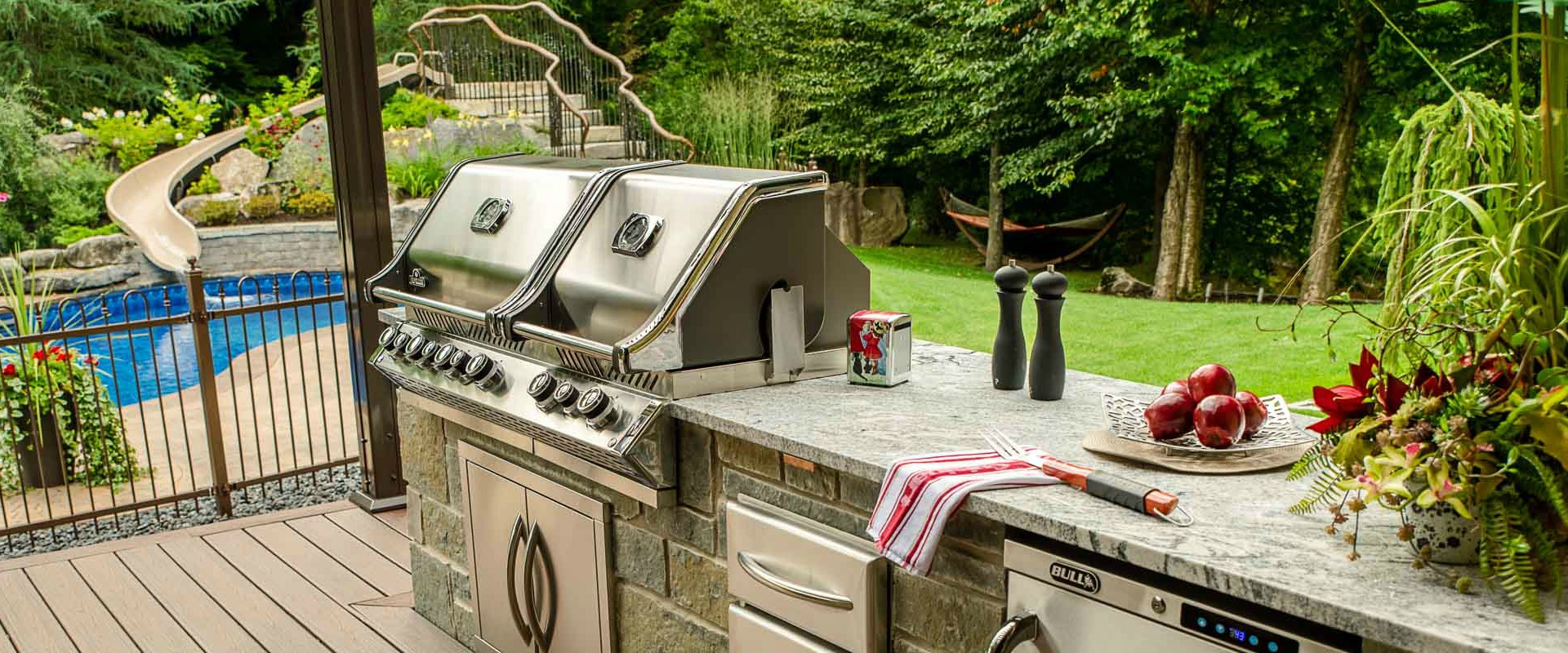 Quoi de mieux que de cuisiner à l’extérieur sur une magnifique cuisine extérieure sur mesure. La pergola SunLouvre surplombe le grand patio de Trex.